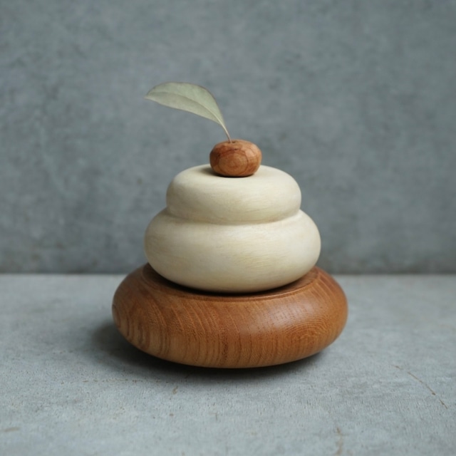【木そのものの色や質感を、丸ごと楽しむ鏡餅】 神奈川県内の里山整備や街路樹の剪定から得た木を使い、ひとつひとつ削り出しました。 木目や色合い、節の表情はすべて異なり、「うちの子」と愛でたくなる鏡餅です。 みかん部分には小さな穴をあけているので、 南天や松、ドライフラワーなど、お好きな植物を挿してアレンジも楽しめます。 台座は、食べものを直接のせても安心な塗装仕上げ。 お正月の鏡餅とはもちろん、 お月見団子や大福をのせて、季節のしつらえとして一年を通して活躍します。 箱のフタには、お正月とお餅を満喫する「むくこ」の手描きイラスト入り。 ※絵柄はランダムです。 贈りものにも、自分やご家族のご褒美にもおすすめです。 みかん:ケヤキ(オイル仕上げ) 餅:アカメガシワ(ソープフィニッシュ) 台:ホオノキ(ガラス塗料) 餅:直径約65mm×高さ約45mm/台:直径約80mm×高さ約60mm