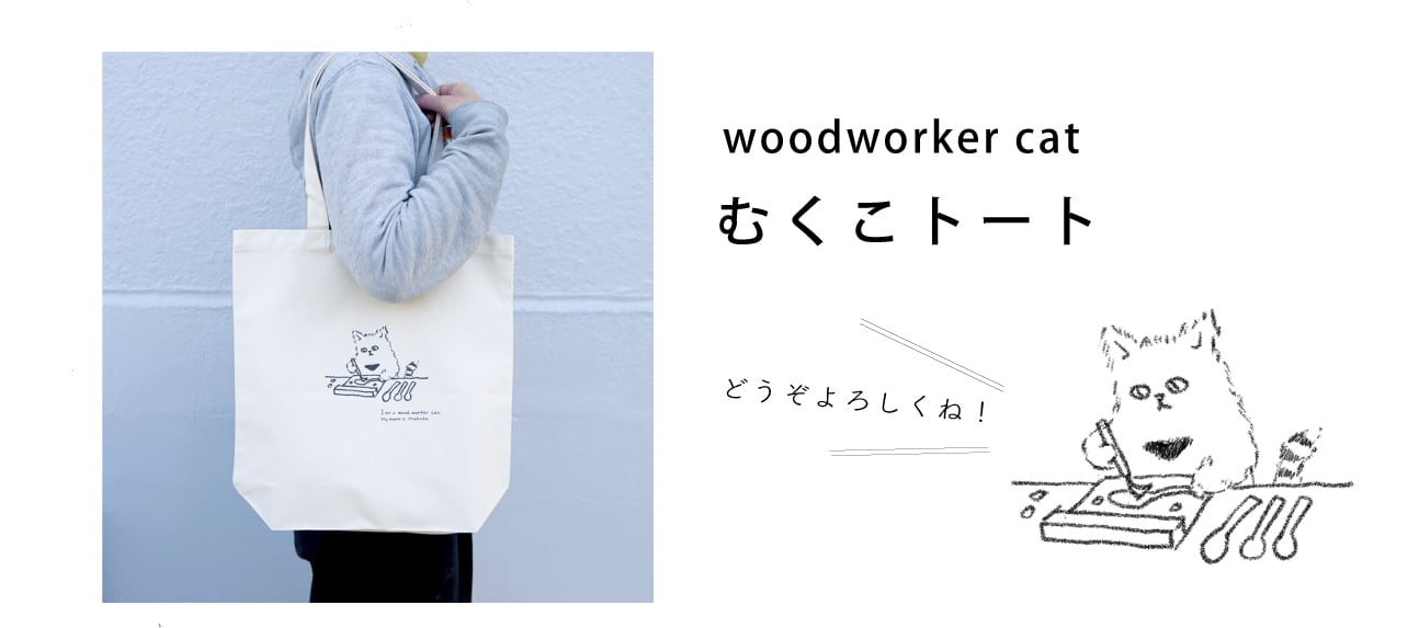みなさまご待望。woodworker cat むくこのトートバッグができました。スプーンをノミで削っているむくこの姿をいつでも愛でていただけます。 A4サイズがゆったり入る大きさのマチありトートバッグ。持ち手が長いので肩掛けも可能です。 厚手生地で透けにくく、持ち手がしっかりしているため500mlのペットボトルやノートパソコンなど、少し重みがあるものも安心して運べます。 ノミ、玄翁などの軽めの工具用バッグにもおすすめ。(鋭利なものはカバーをしてくださいね) むくフクロのポーチや巾着を入れて使えばもぅ完ペキ最高です。 たくさんお出かけしてみんなに自慢して歩いてくださいませね。 ・平置きサイズ:約縦370×横360×マチ110mm(船底) ・立体サイズ:約縦370×横250×マチ110mm ・持ち手サイズ:約W25xL560mm ・容量:約10L ・材質:綿 【 お手入れについて 】 ○水や洗剤で洗っても絵柄は落ちませんが、強くこすると退色する可能性があるため、手洗いでやさしくもみ洗いがおすすめです。